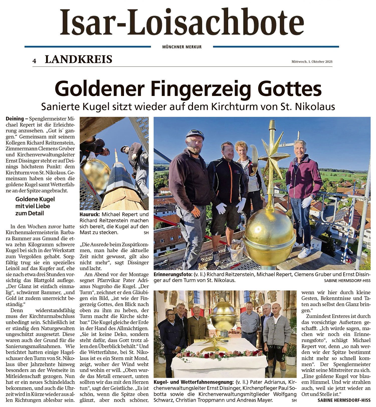 Besondere Aufträge von der Gemeinde – wie die Marienkappele von Dettenhausen oder St. Nikolaus in Egling-Deining – liegen uns besonders am Herzen, denn sie verbinden traditionelles Handwerk mit Verantwortung für das Ortsbild. Jedes Mal, wenn wir in luftiger Höhe das glänzende Blech anbringen und den Blick über das Dorf schweifen lassen, erfüllt uns Stolz. Wir freuen uns, mit unserer Arbeit einen Beitrag zur Schönheit unserer Heimat leisten zu können.